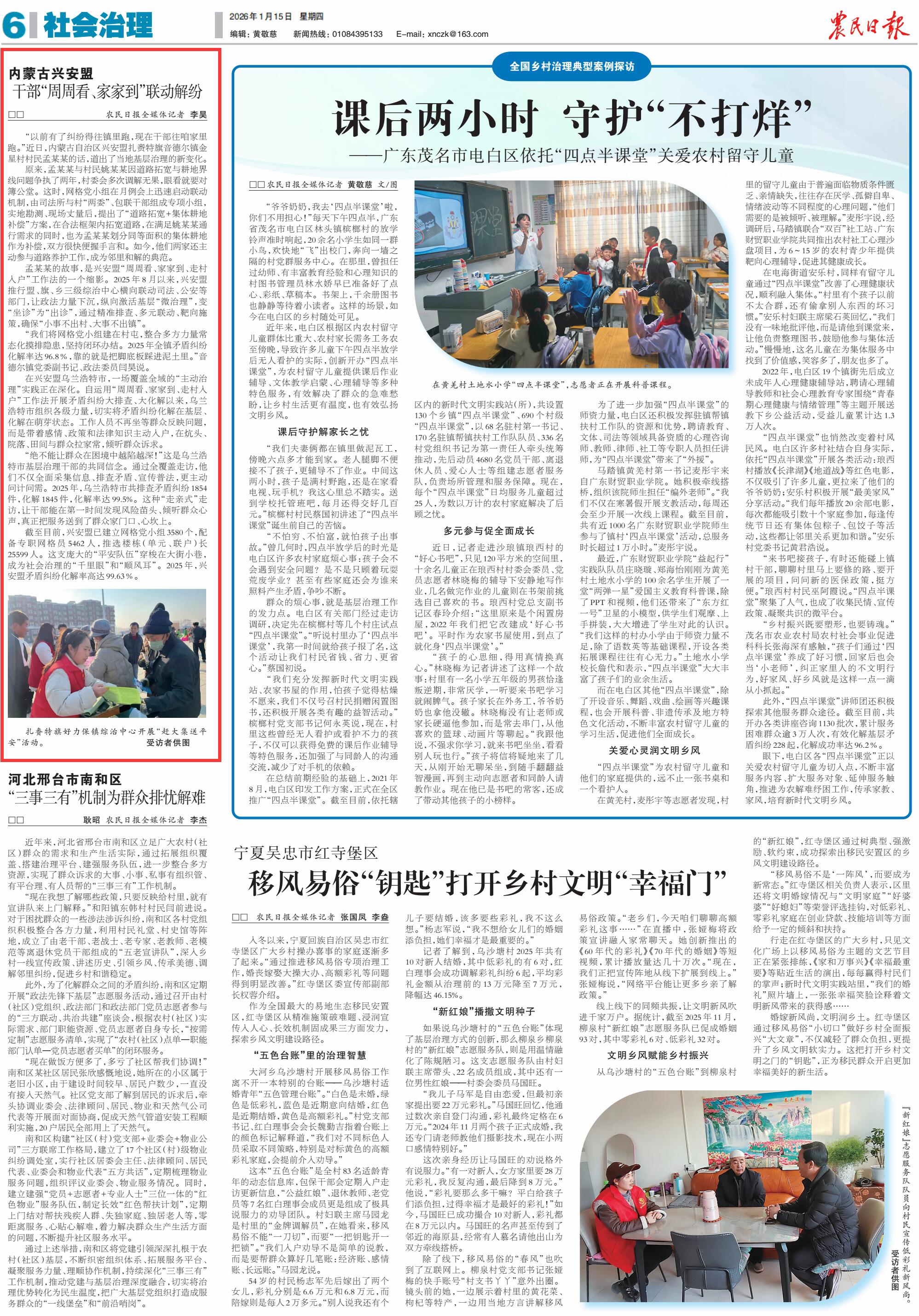 2026年1月15日,《農(nóng)民日?qǐng)?bào)》第6版刊發(fā)題為《內(nèi)蒙古興安盟 干部“周周看、家家到”聯(lián)動(dòng)解紛》的文章,報(bào)道了2025年8月以來,興安盟推行盟、旗、鄉(xiāng)三級(jí)綜治中心橫向聯(lián)動(dòng)司法、公安等部門,讓政法力量下沉,縱向激活基層“微治理”,變“坐診”為“出診”,通過精準(zhǔn)排查、多元聯(lián)動(dòng)、靶向施策,確?!靶∈虏怀龃?、大事不出鎮(zhèn)”。