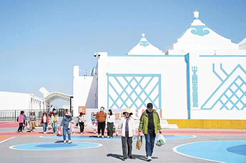 雄偉的策克口岸國(guó)門東側(cè),是一排排商業(yè)區(qū),商店、飯店、文化設(shè)施等一應(yīng)俱全,假日里游客眾多,熱鬧非凡;國(guó)門西側(cè),一座座形似蒙古包的白色建筑整齊排列,這就是中蒙邊民互市貿(mào)易區(qū)。策克口岸工作人員張銳介紹,自2014年起,經(jīng)過(guò)持續(xù)建設(shè)與完善,中蒙邊民互市貿(mào)易區(qū)逐步成形。依托這一平臺(tái),口岸常態(tài)化舉辦特色商品展會(huì),聚集了人氣,帶動(dòng)了邊境旅游。