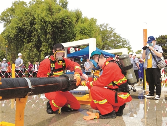 陣陣白煙模擬的是道路中壓燃?xì)夤艿佬孤?,接到?bào)警后,119消防指揮中心第一時(shí)間通過應(yīng)急聯(lián)絡(luò)系統(tǒng)通知住建部門和燃?xì)馄髽I(yè)到場(chǎng)處置,同時(shí)消防救援力量到達(dá)現(xiàn)場(chǎng)對(duì)泄漏點(diǎn)進(jìn)行處置。接到通知后,中浩燃?xì)夤緭屝藜皯?yīng)急處置人員到達(dá)現(xiàn)場(chǎng),對(duì)泄漏區(qū)域20米范圍內(nèi)進(jìn)行圍擋警戒,并攜帶可燃?xì)怏w檢測(cè)儀對(duì)周邊環(huán)境進(jìn)行檢測(cè),以防人員受傷,保證作業(yè)安全。應(yīng)急處置人員佩戴空氣呼吸器進(jìn)入現(xiàn)場(chǎng),確定漏點(diǎn)及管道尺寸,用膠帶對(duì)漏點(diǎn)進(jìn)行臨時(shí)處理,加裝管道抱卡,臨時(shí)封堵管道?,F(xiàn)場(chǎng)指揮人員根據(jù)處置情況,集結(jié)隊(duì)伍,利用運(yùn)行不停輸維修設(shè)備進(jìn)行管道維修。這一連串的操作下來,泄漏點(diǎn)被及時(shí)修好。負(fù)責(zé)此次演練的內(nèi)蒙古中浩燃?xì)庥邢薰究偨?jīng)理賈鵬程介紹,這套不停輸管道維修設(shè)備,既節(jié)約了成本,又能保證安全供氣,能更好地服務(wù)保障廣大市民群眾。