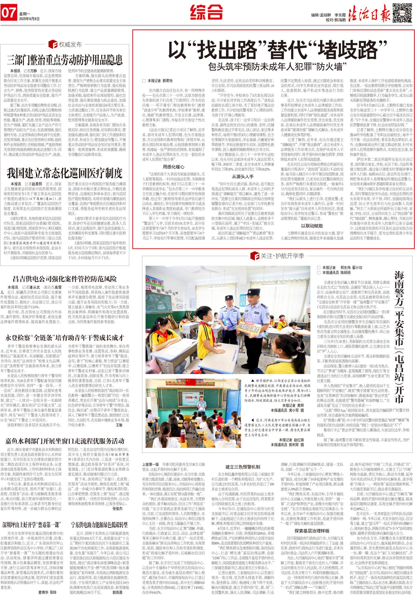 2025年9月8日,《法治日報》第7版整版刊發(fā)題為《以“找出路”替代“堵歧路” 包頭筑牢預(yù)防未成年人犯罪“防火墻”》的文章,報道了近年來,面對未成年人犯罪問題,包頭市委政法委、市公安局和市教育局等部門多措并舉,從源頭預(yù)防到末端治理,從校園教育到矯正教育,構(gòu)建起一張嚴密的防范網(wǎng)絡(luò),有效遏制了未成年人違法犯罪的發(fā)生,打出一套防范未成年人犯罪的“組合拳”。
