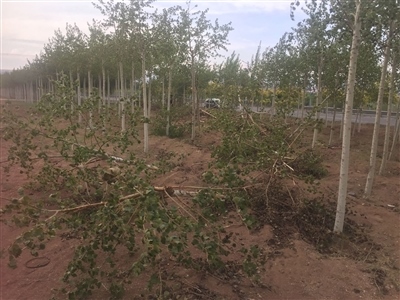 民警趕到現(xiàn)場檢查發(fā)現(xiàn),32棵6年生的河北楊及1棵金葉榆被撞倒,肇事車輛不知所蹤,現(xiàn)場只留下車輛紅色前保險(xiǎn)杠殘片和15米長的車輛輪胎痕跡。