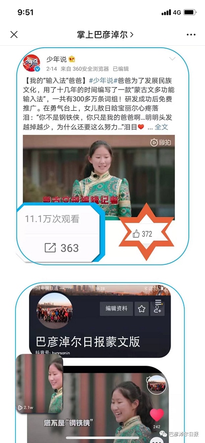 緊跟當(dāng)?shù)責(zé)狳c(diǎn)新聞,關(guān)注民生民情,打造了“輸入法爸爸”“聽音樂(lè)的羊”“蒙古舞課間操”“11歲男孩豬圈寫作業(yè)順手接生了7頭豬崽”等一批點(diǎn)擊量超千萬(wàn)次的現(xiàn)象級(jí)融媒體“爆款產(chǎn)品”,視頻總點(diǎn)擊量超過(guò)1億。特別是“蒙古舞課間操”,2020年9月28日在央視一套《新聞聯(lián)播》播出,是全自治區(qū)首家在央視一套《新聞聯(lián)播》播出的黨報(bào)媒體。原創(chuàng)短視頻《一路跋山涉水,巴彥淖爾這只回家的駱駝感動(dòng)戈壁》先后登上微博熱搜、抖音熱榜,被央視新聞、人民日?qǐng)?bào)客戶端、新華社客戶端、騰訊新聞及全國(guó)各大媒體的微信、微博、抖音、快手爭(zhēng)相轉(zhuǎn)發(fā),僅微博話題閱讀量就達(dá)到了3億次。
