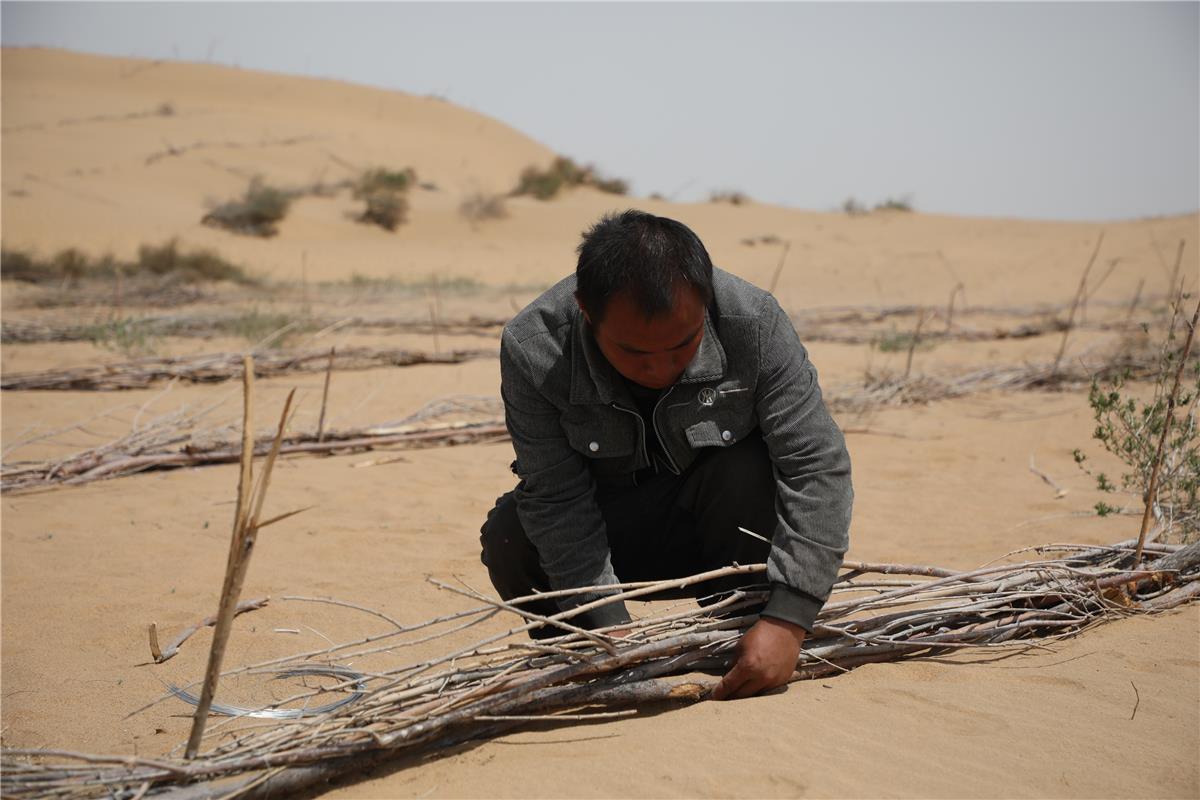 在鄂爾多斯市庫布其沙漠S215穿沙公路沙化土地綜合治理項目現(xiàn)場,工人正在固定沙障。(資料圖)