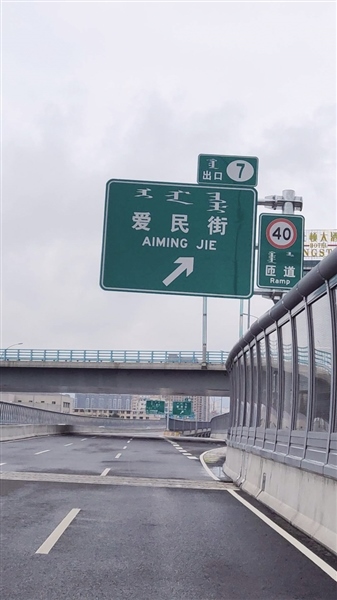 當日,記者駕車來到哲里木路高架橋,沿南向北方向行駛,看到沿路提示愛民街下行匝道口的路牌一共有4塊,每塊上都有中文和拼音,顯示為“愛民街”“AIMING JIE”。記者從愛民街下行匝道口到達愛民街與哲里木路輔路交會處,在東西方向的愛民街路口發(fā)現(xiàn)路牌名是由中文、蒙古文和拼音組成,其中拼音為“AIMIN JIE”。因呼市地區(qū)方言中,“MING”與“MIN”的發(fā)音不易分辨,這也是為什么網友在視頻中說用方言命名路名的原因。