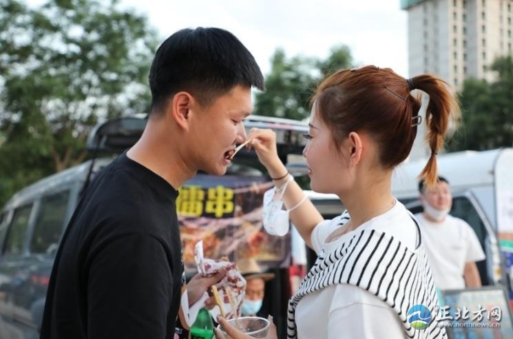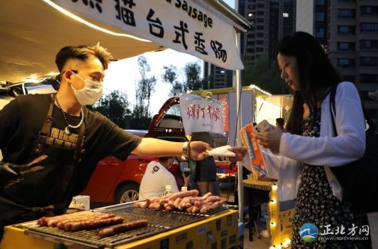 人間煙火氣,最撫凡人心。雖然已是21時許,但是后備廂集市依然人頭攢動,熱鬧非凡,叫賣聲不絕于耳。一家烤腸攤位前,攤主郭浩楠一邊招呼食客,一邊拿著夾子不緊不慢地翻動著烤架上的烤腸,烤好后拿竹簽一穿,伴著滋滋作響的聲音,紅光透亮的烤腸瞬間香氣四溢?!耙呀泤⒓恿撕脦讏隽?,一晚上能售出近百根烤腸,不過我的初衷不是為了賺錢,就是想把自己鐘情的美食分享給大家?!惫崎f。