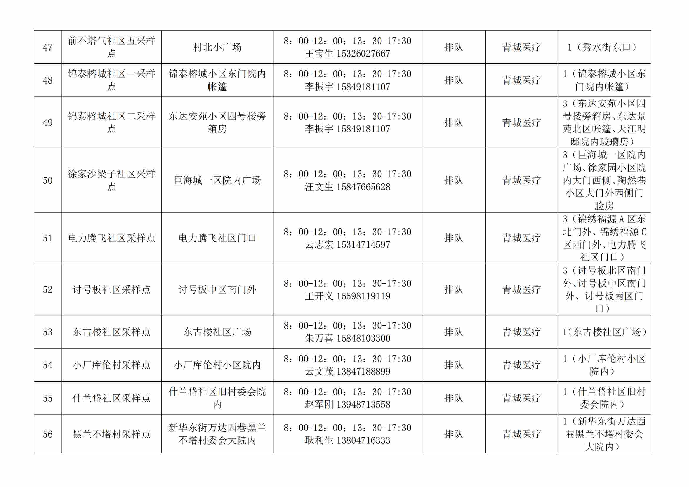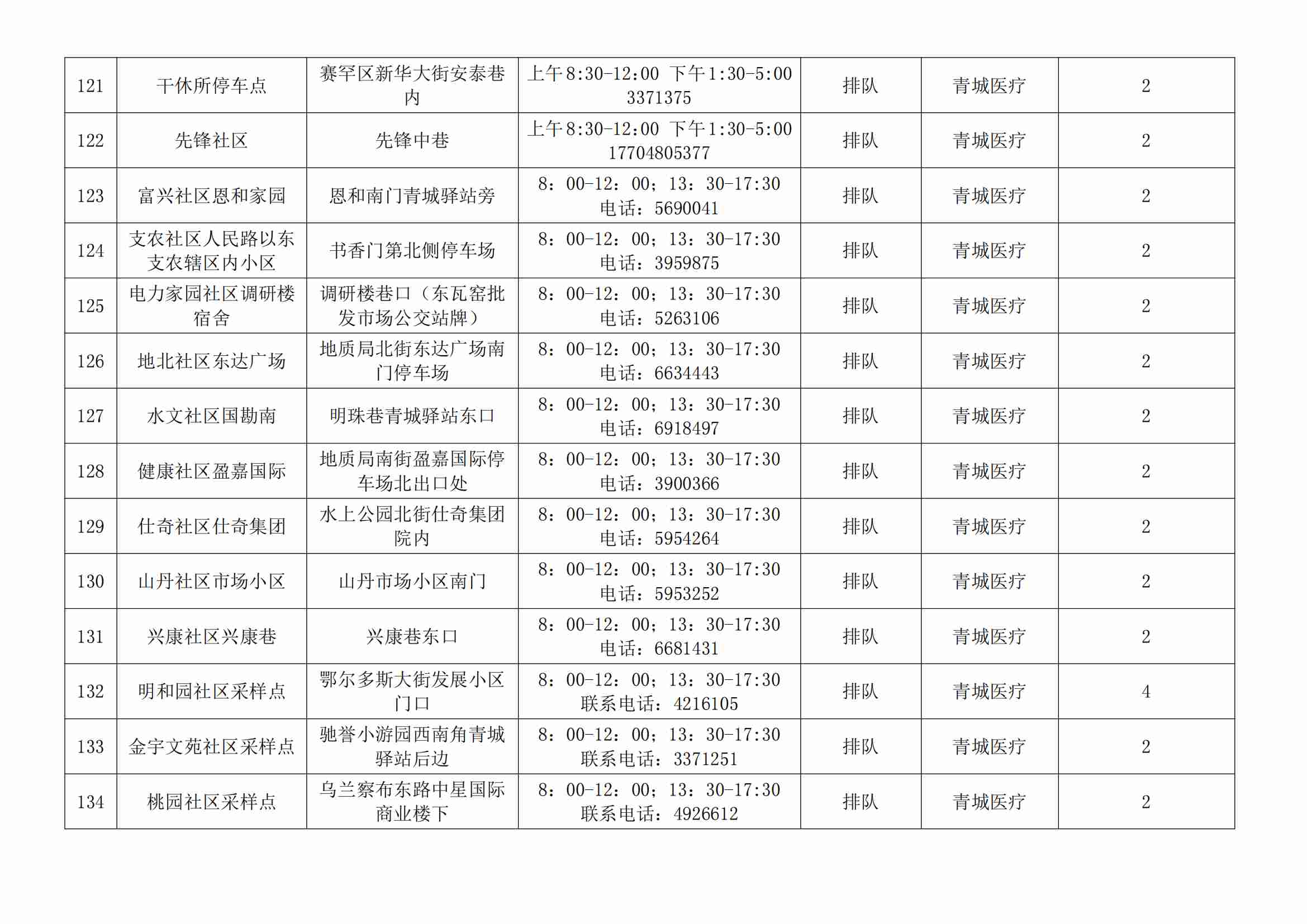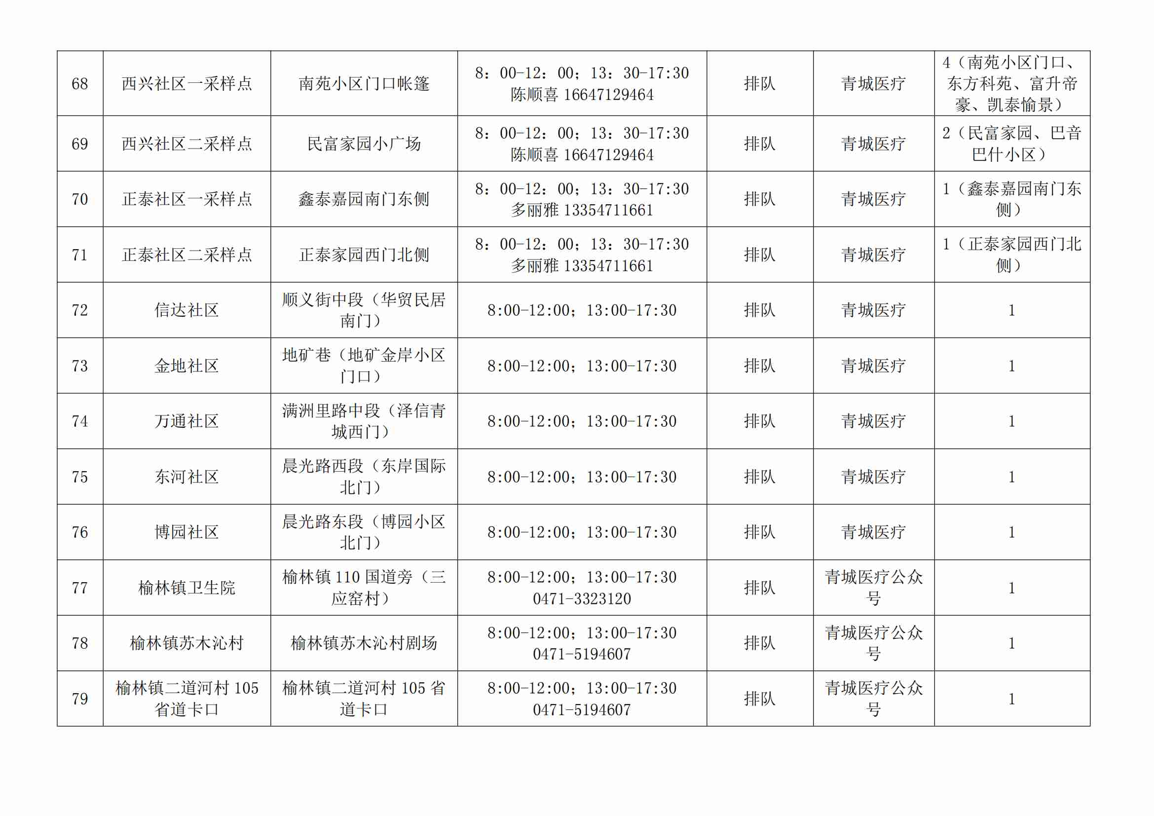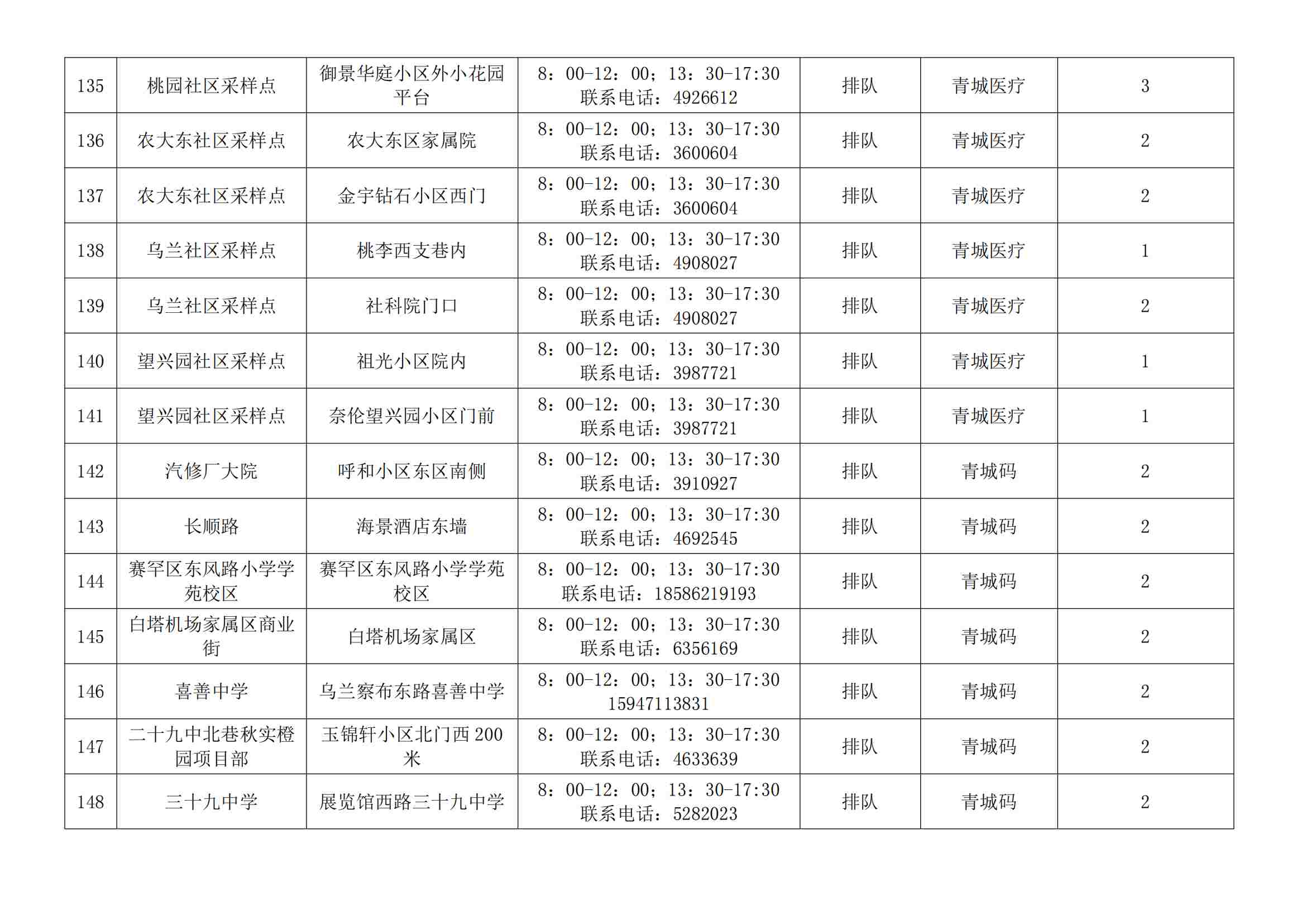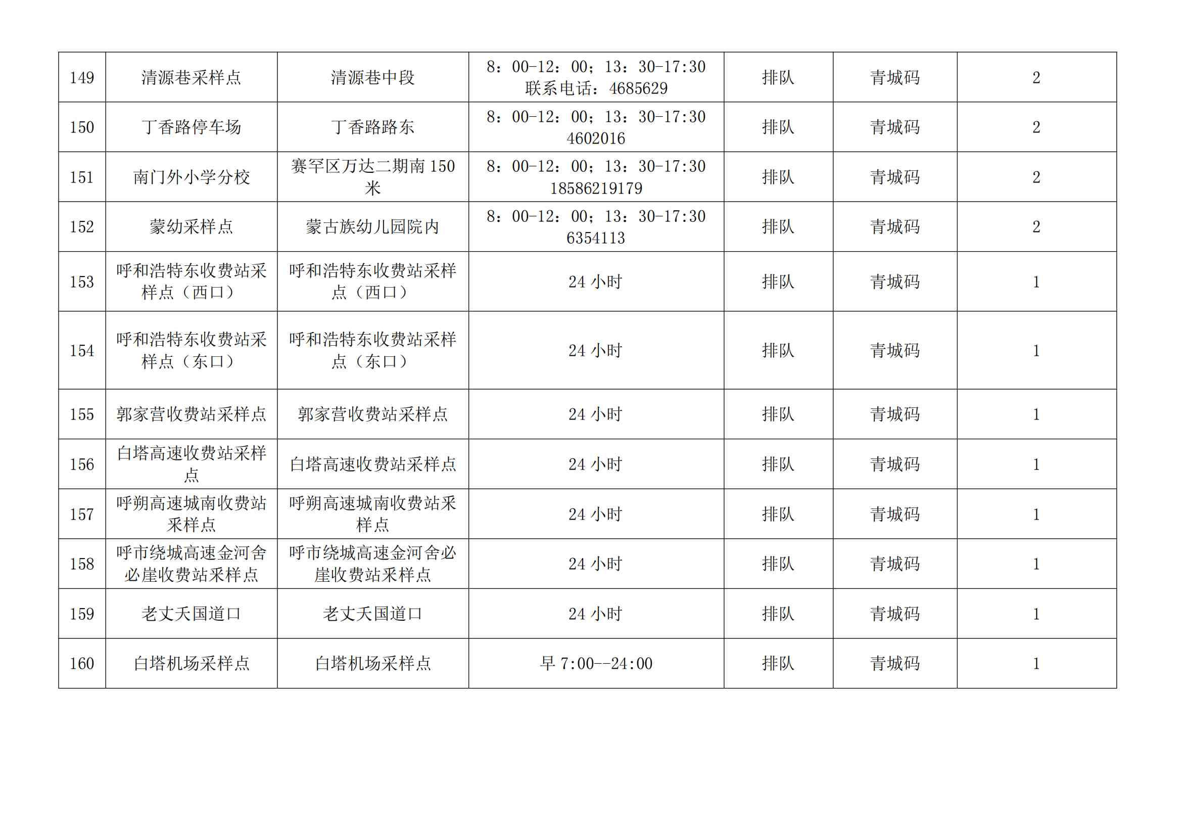 根據(jù)全市核酸檢測政策的調(diào)整,為滿足市民就醫(yī)、出行、工作等核酸檢測需求,賽罕區(qū)開放160個便民核酸采樣點(詳見附表),廣大市民可就近選擇,核酸結(jié)果從青城碼查詢。