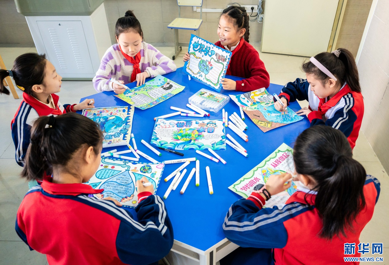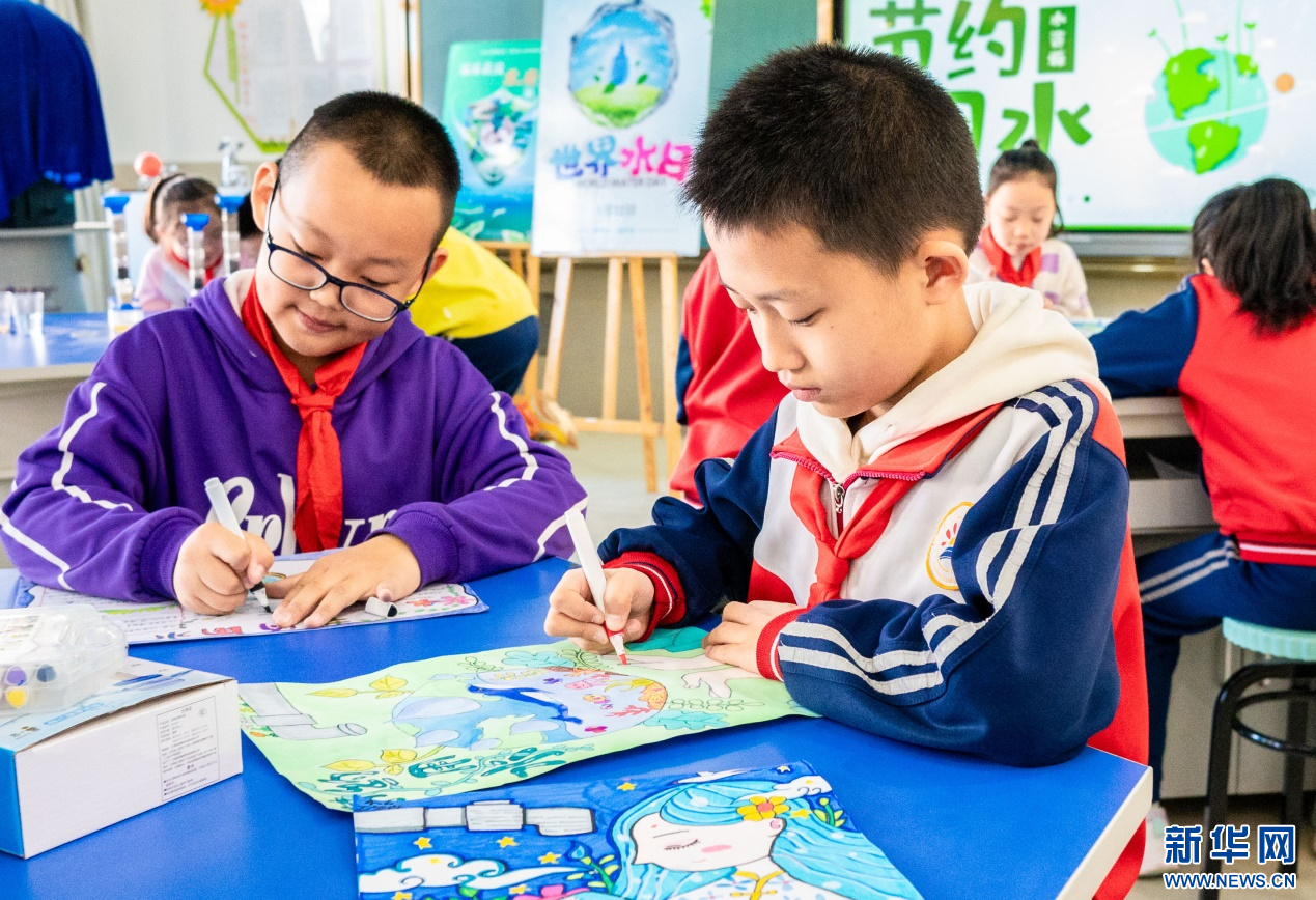 ??3月20日,呼和浩特市玉泉區(qū)石東路小學(xué)學(xué)生在繪制以“節(jié)約用水 從我做起”為主題的手抄報。新華網(wǎng)發(fā)(丁根厚 攝)
