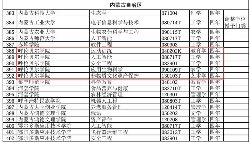 近日,教育部公布了《2024年度普通高等學(xué)校本科專業(yè)備案和審批結(jié)果》,其中,呼倫貝爾學(xué)院申報(bào)的“運(yùn)動(dòng)訓(xùn)練”(專業(yè)代碼040202K,教育學(xué))、“人工智能”(專業(yè)代碼080717T,工學(xué))、“安全工程”(專業(yè)代碼082901,工學(xué))、“應(yīng)用生物科學(xué)”(專業(yè)代碼090109T,農(nóng)學(xué))、“非物質(zhì)文化遺產(chǎn)保護(hù)”(專業(yè)代碼130103T,藝術(shù)學(xué))5個(gè)本科專業(yè)成功獲批。本次備案和審批的相關(guān)專業(yè),擬列入該校2025年本科招生計(jì)劃。