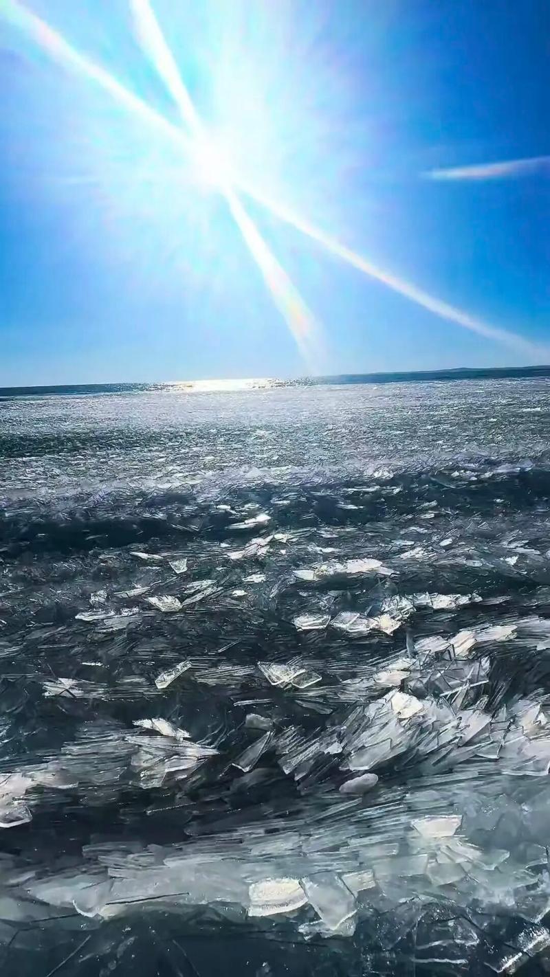 在無人機(jī)航拍視角下,2239.9平方公里的湖面上,冰排與未完全封凍的水域交織分布,白色冰體與湛藍(lán)湖水相映,宛如大地鋪展的巨型碧玉上鑲嵌的銀紋??拷行牡膮^(qū)域,新凍結(jié)的冰層還呈現(xiàn)出細(xì)膩的冰花紋路,而岸邊的冰排群中,隱約可見因地下泉眼涌動(dòng)形成的“清眼”,表面覆著薄霜,在陽光下泛著微光。