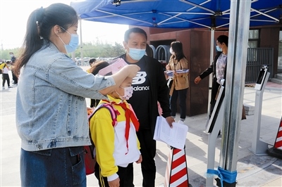 “等了這么久,終于可以和同學們說句:早上好?!?月2日,早上7點剛過,通遼新城第一中學小學部二年一班的班主任崔老師早早的在校門口,迎接班里的小朋友們。記者在校門口看到,此時,小學部二、三年級的小朋友已經(jīng)陸續(xù)入校了,顯然,“萌娃”們已經(jīng)被校門口的層層關(guān)卡震撼到了,幸好,在眾多老師的幫助和指引下順利進入了校門。進入了校門后,還有一道重要關(guān)卡,測量體溫,習慣了伸出手臂來測量體溫的“萌娃”們,對著紅外線測溫儀卻不知所措了,有的對著測溫儀伸出了手臂、有的對著測溫儀行禮,著實“萌”翻了現(xiàn)場所有人。“崔老師,我們都想你了?!币姷綆孜恍∨笥岩獪惖礁皟海蘩蠋熈⒖烫嵝淹瑢W們:我也很想念你們,但是我們要保持“一米”的距離,快去教室吧!小朋友們被“殘忍”拒絕,很是失落。