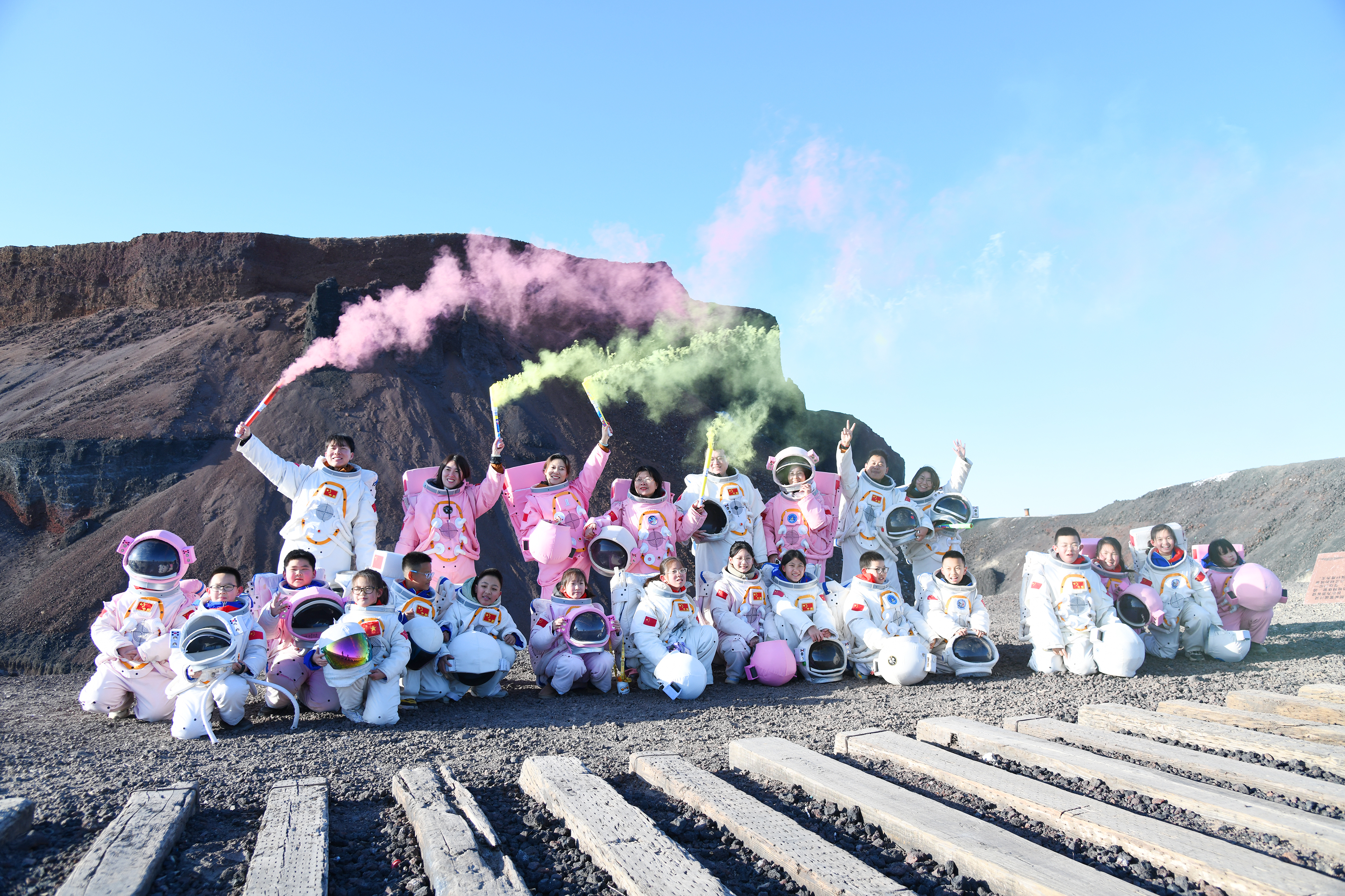“我在火山,誰也不想!”“快幫我們拍張合影,簡直像在登陸火星?!痹跒跆m哈達火山地質(zhì)公園6號火山腳下,冬令營學(xué)員有的身著宇航服,手舉彩煙棒,紛紛擺出各種姿勢打卡拍照、分享留念;有的在老師的帶領(lǐng)下,沿著棧道撿拾火山石,并觀察石頭構(gòu)造,與老師共同探究跨越萬年的地質(zhì)奇跡。