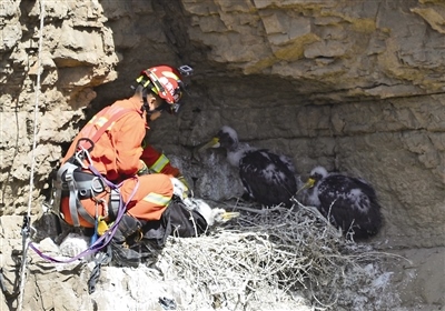 當(dāng)天7時左右,在烏海市海勃灣區(qū)甘德爾山景區(qū)半山腰處,攝影愛好者焦長青在拍攝時發(fā)現(xiàn)了一窩出生20多天的幼年野生黑鸛,其中一只黑鸛行動異常,疑似受傷。他立即撥打了119報警電話,同時聯(lián)系了烏海市野生動物保護部門。9時許,烏海市消防支援支隊光明路特勤站和烏海市野生動物保護部門的工作人員到達(dá)現(xiàn)場。經(jīng)勘查,在距離懸崖正下方大約30米處的巖洞內(nèi),一只幼年黑鸛被尼龍繩纏繞住腿部而受傷,不能行動。消防員隨后尋找合適的位置制作錨點。消防員陳意攜帶救援裝備速降到懸崖下方展開營救,一個小時之后,受傷的幼年黑鸛被成功救出,并送往海勃灣區(qū)林業(yè)草原局救助站進行救治。