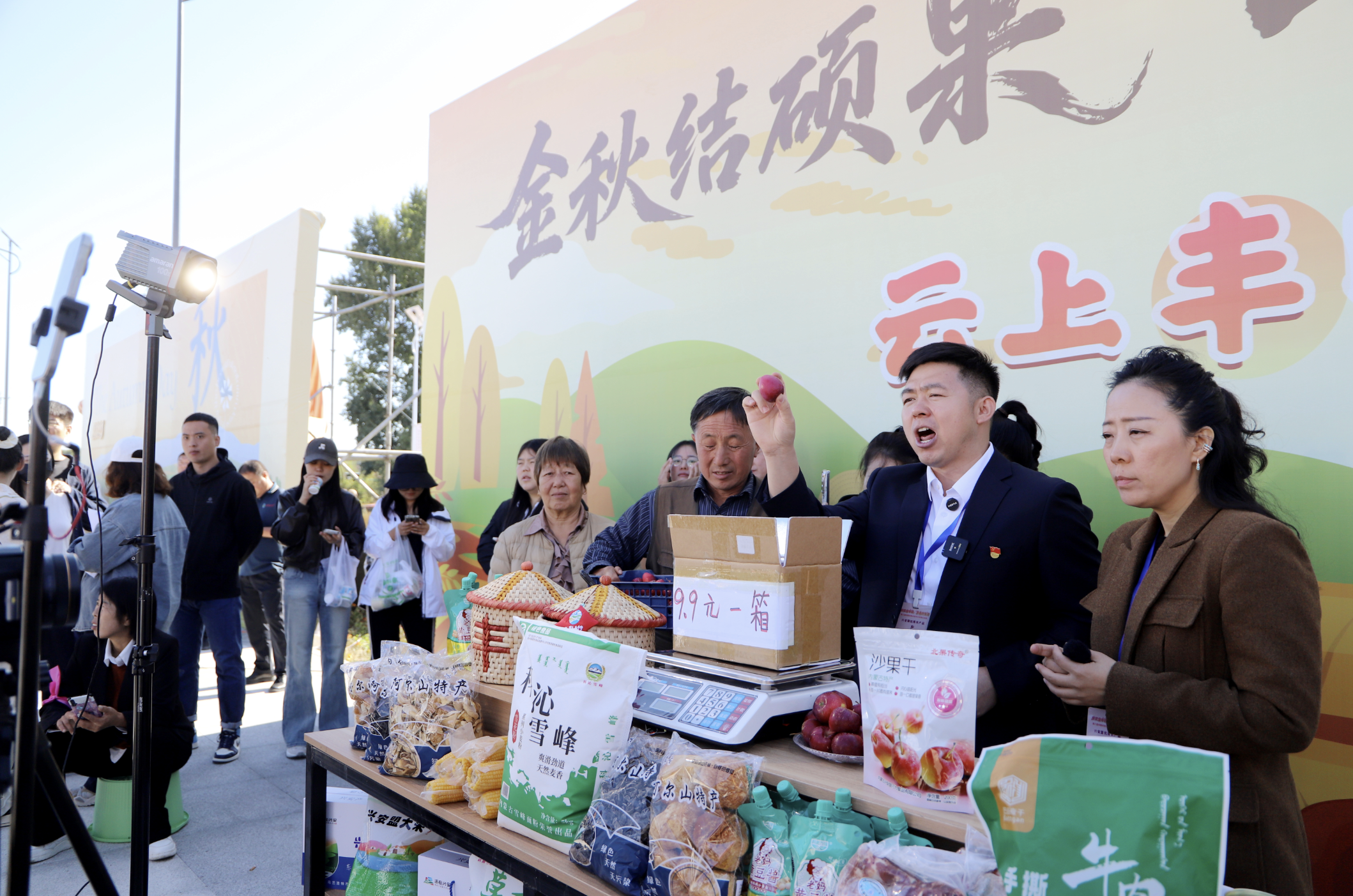 “這都是我們本地的農產品,我現(xiàn)在正在豐收節(jié)的現(xiàn)場,各位朋友抓緊下單,興安盟產品不會讓你失望!”活動現(xiàn)場,烏蘭浩特市義勒力特鎮(zhèn)西包達力干嘎查駐村干部王曉龍將直播間設在現(xiàn)場,與村民在豐收的熱情氛圍中一起賣力地推介家鄉(xiāng)好物。