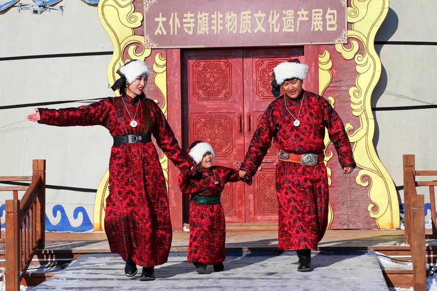 冬季察哈爾民族服飾比賽中,來自貢寶拉格蘇木各嘎查的牧民身著鮮艷的民族服飾依次出場,展現(xiàn)察哈爾傳統(tǒng)服飾的獨特魅力和文化內(nèi)涵,助力北疆文化的傳承和弘揚。