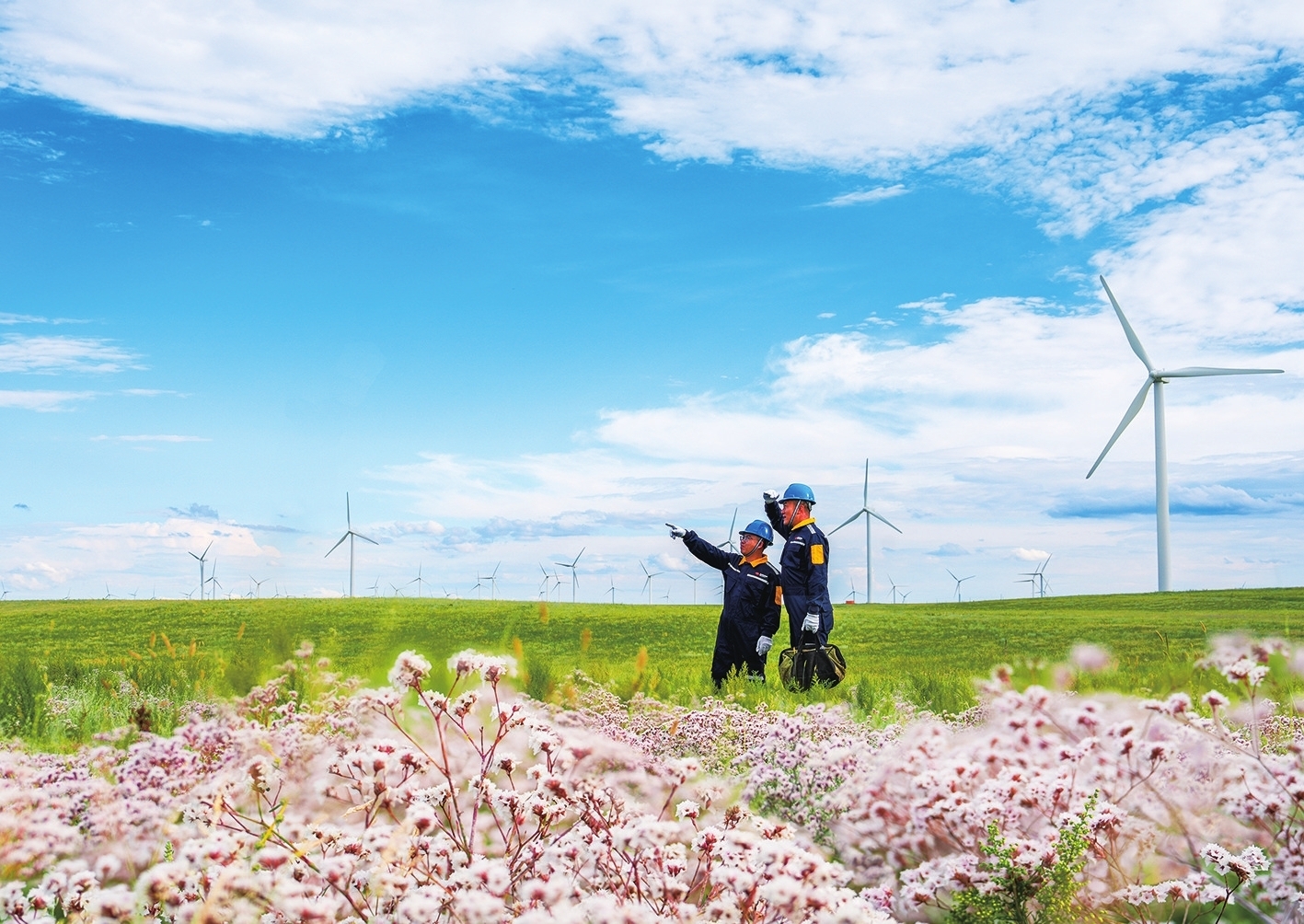 近日,國華投資蒙東分公司輝騰梁風(fēng)電場內(nèi),風(fēng)機群與遍野花海相映成趣,兩名風(fēng)電運維工程師,正在交流剛處理完的偏航故障細(xì)節(jié),核對風(fēng)速儀、風(fēng)向標(biāo)校準(zhǔn)數(shù)據(jù),討論后續(xù)防沙維護措施,同時檢查設(shè)備運行狀態(tài),確保風(fēng)機穩(wěn)定發(fā)電。