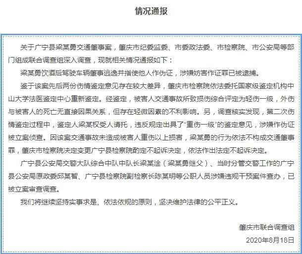 據(jù)肇慶市官方發(fā)布公眾號“肇慶發(fā)布”消息,關(guān)于廣寧縣梁某勇交通肇事案,肇慶市紀(jì)委監(jiān)委、市委政法委、市檢察院、市公安局等部門組成聯(lián)合調(diào)查組深入調(diào)查,通報(bào)相關(guān)情況:梁某勇飲酒后駕駛車輛肇事逃逸并指使他人作偽證,涉嫌妨害作證罪已被逮捕。