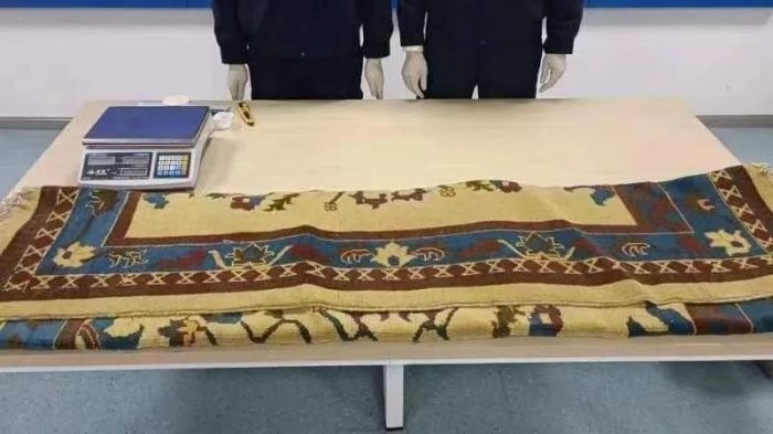 深圳郵局海關(guān)關(guān)員在對過境貨物開展監(jiān)管時發(fā)現(xiàn),1票包裹機檢圖像可疑,隨即對其開箱查驗。查驗發(fā)現(xiàn),該票包裹內(nèi)有一塊做工精致的地毯,編織到地毯內(nèi)的透明細塑料管中藏匿有細粉末一批,毛重11555.8克。經(jīng)現(xiàn)場試劑檢測,判斷為冰毒。目前,海關(guān)緝私部門已介入調(diào)查處理。
