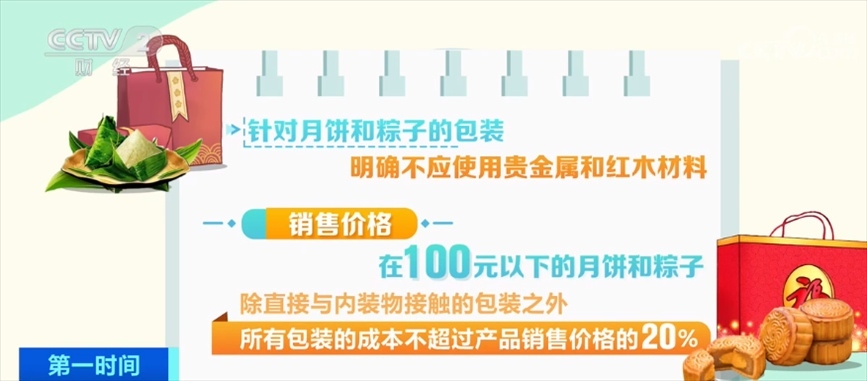 針對(duì)月餅和粽子的包裝,明確不應(yīng)使用貴金屬和紅木材料;銷售價(jià)格在100元以下的月餅和粽子,除直接與內(nèi)裝物接觸的包裝之外,所有包裝的成本不超過(guò)產(chǎn)品銷售價(jià)格的20%;售價(jià)在100元以上的,包裝成本不超過(guò)產(chǎn)品銷售價(jià)格的15%。