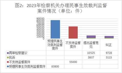 2023年,全國檢察機關(guān)始終堅持以習(xí)近平新時代中國特色社會主義思想特別是習(xí)近平法治思想為指導(dǎo),認(rèn)真貫徹落實《中共中央關(guān)于加強新時代檢察機關(guān)法律監(jiān)督工作的意見》,以“高質(zhì)效辦好每一個案件”作為履職辦案的基本價值追求,以專業(yè)化建設(shè)為基礎(chǔ),以提升辦案能力和水平為目標(biāo),認(rèn)真貫徹實施民法典,扎實推進民事生效裁判監(jiān)督、審判活動監(jiān)督、執(zhí)行活動監(jiān)督、支持起訴、虛假訴訟監(jiān)督等各項工作,在完善案卷調(diào)閱制度、民事再審檢察建議制度、促進社會治理等方面取得新進展新成效。