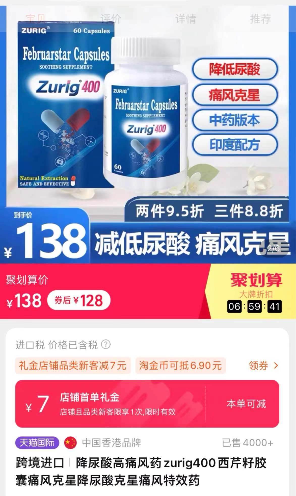 此外,zurig400在銷售頁面還模仿印度zurig80,宣稱降尿酸、痛風(fēng)藥。澎湃新聞記者調(diào)查發(fā)現(xiàn),zurig400目前在多個網(wǎng)購平臺有售,有商家顯示已出售4000+。 經(jīng)了解后得知,印度zurig80實際上是一款仿制藥,目前國內(nèi)并未獲批上市;而zurig400卻是一款香港產(chǎn)的保健品類目產(chǎn)品,并非藥品。但產(chǎn)品宣傳時卻使用“痛風(fēng)特效藥”“印度配方”“中藥非布”等詞語,讓患者產(chǎn)生誤會。