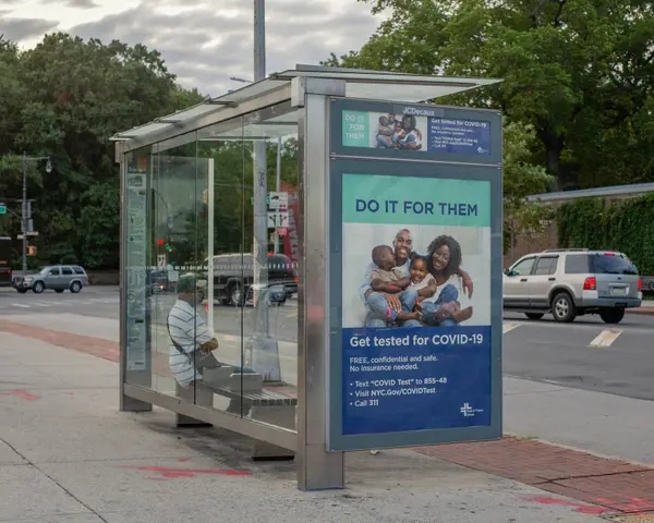△美國(guó)紐約布魯克林一個(gè)公交車站的免費(fèi)核酸檢測(cè)廣告 (圖片來源:《紐約時(shí)報(bào)》)