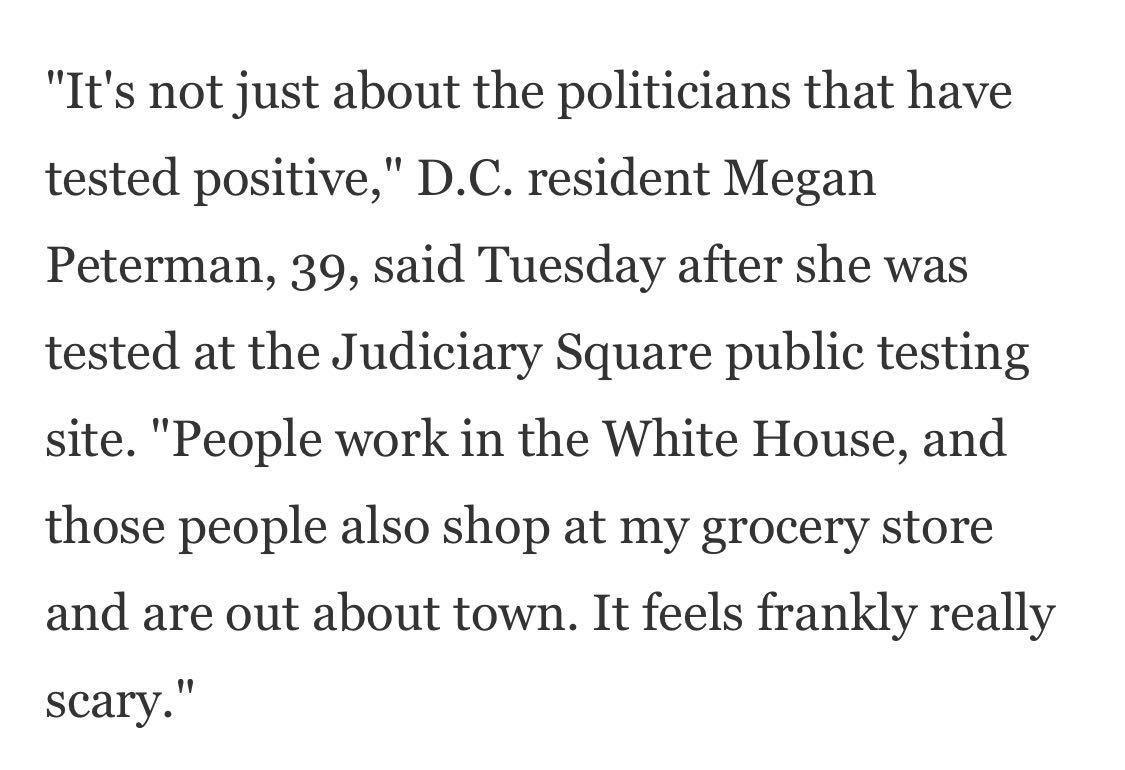 華盛頓居民梅根·彼得曼在當(dāng)?shù)貢r(shí)間6日做了核酸檢測(cè),她說:“最近許多白宮官員確診新冠肺炎,白宮工作人員也可能來過我的商店購(gòu)物,說實(shí)話挺嚇人的?!薄 ?/p>