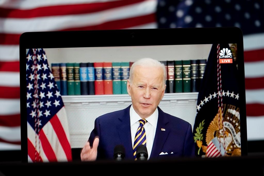 2022年3月8日拍攝的視頻畫面顯示,美國總統(tǒng)拜登在華盛頓白宮發(fā)表講話。拜登當(dāng)天宣布,美國將對俄實(shí)施能源禁運(yùn),停止從俄進(jìn)口石油、天然氣和煤炭。新華社記者劉杰攝