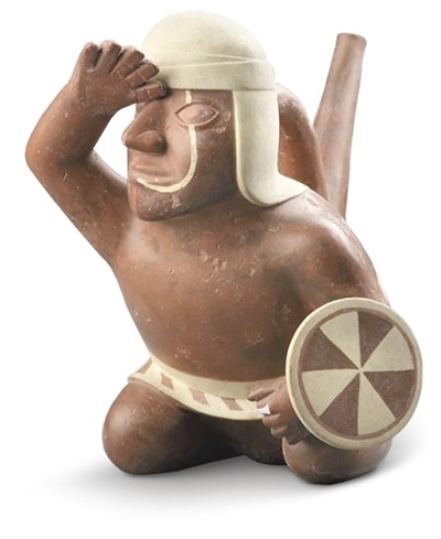 在展廳醒目位置,擺放著一件莫切文明時(shí)期(公元100年—800年)的戰(zhàn)士陶器,他皮膚深褐、高眉大眼、神情堅(jiān)毅,腰間系著白色外衣,頭上戴著布帽。這名戰(zhàn)士身體微微前傾,跪坐在地,左手持盾牌,右手搭于額前,向著遠(yuǎn)方眺望。這件戰(zhàn)士陶器身高雖不足20厘米,卻體態(tài)生動(dòng),僅使用簡(jiǎn)練的線條與棕白兩色,便將一位莫切戰(zhàn)士形象刻畫得活靈活現(xiàn)。在雷瓜伊文明時(shí)期(公元前200年—公元650年)的動(dòng)物陶器展臺(tái)前,總是有不少孩童圍繞。兇猛的美洲虎、呆萌的羊駝、神秘的未知生物,各種陶器與石器器身僅用黑、紅、白三色裝飾,形態(tài)各異、生動(dòng)活潑,透過玻璃柜懵懂地望向千年后的小觀眾們。