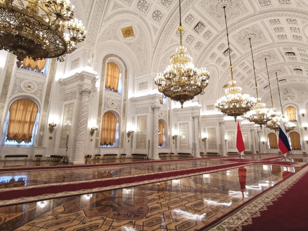 在雄壯激昂的迎賓曲中,習(xí)近平主席和普京總統(tǒng)分別從喬治大廳兩側(cè)沿紅地毯闊步走入大廳中央。