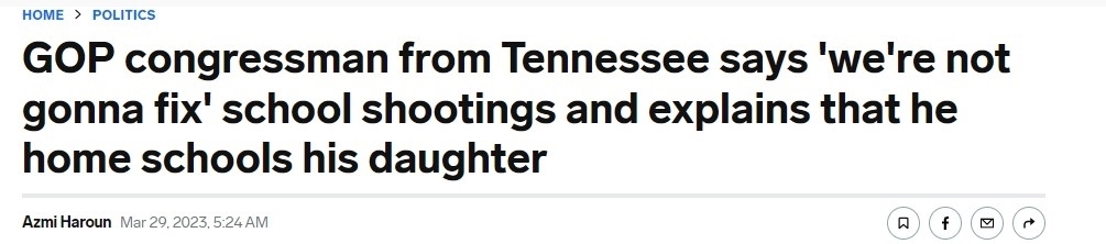 據(jù)美國《商業(yè)內(nèi)幕》新聞網(wǎng)站29日報道,田納西州納什維爾市小學(xué)發(fā)生槍擊事件后,該州眾議院議員蒂姆·伯切特面對如果出現(xiàn)類似槍擊事件“該如何保護孩子”的質(zhì)問,直言并未找到解決方法,會讓他的女兒“在家讀書”。