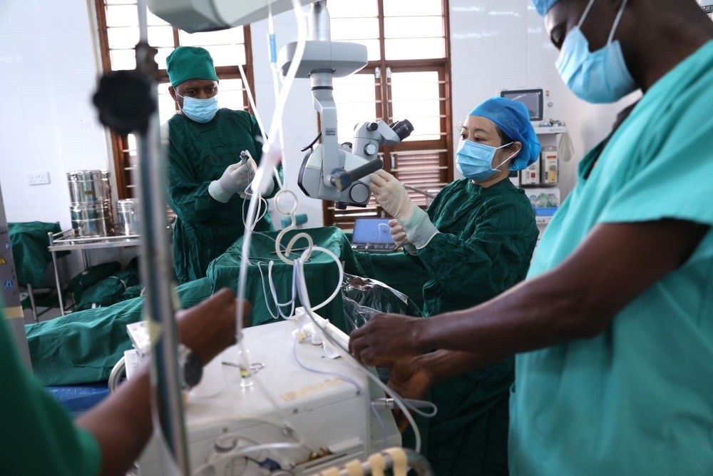 2023年2月23日,在坦桑尼亞桑給巴爾島納茲莫加醫(yī)院,第32期中國援桑給巴爾醫(yī)療隊(duì)的眼科醫(yī)生董莉莉(右二)與桑給巴爾同事一起做術(shù)前準(zhǔn)備。新華社記者 董江輝 攝