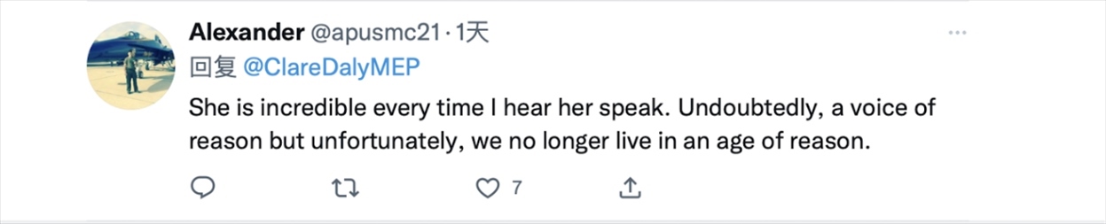 克萊爾·戴利28日在推特上發(fā)布了一條她于19日在歐洲議會全體會議上發(fā)言的視頻,她在視頻上方配文稱,“針對中國可恥的殖民傲慢應該留在過去。問題很簡單。我們是想成為我們大西洋朋友的附庸,還是想與我們最大的貿易伙伴保持和平、獨立的關系?這個伙伴40年來沒有向任何人投過一顆炸彈。”