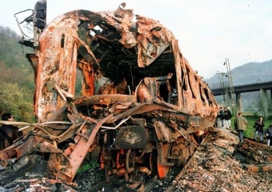 1999年3月24日,以美國(guó)為首的北約向南斯拉夫聯(lián)盟開(kāi)始發(fā)動(dòng)大規(guī)??找u,武力干涉科索沃危機(jī)。資料照片顯示被北約飛機(jī)炸毀的火車。新華社發(fā)