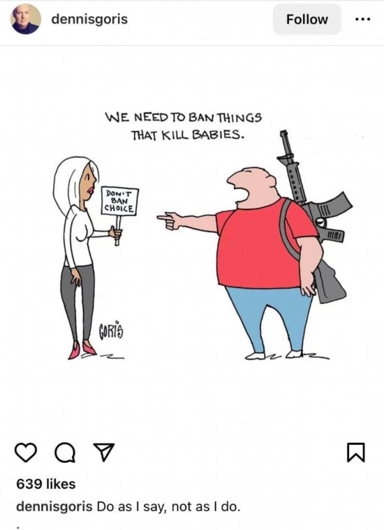 在網(wǎng)友Dennisgoris創(chuàng)作的漫畫(huà)中,一名男子指著一名女子說(shuō),“我們要禁止殺死嬰兒的政策”,卻無(wú)視自己背著的步槍。根據(jù)美國(guó)疾控中心等機(jī)構(gòu)數(shù)據(jù),槍支暴力是美國(guó)兒童和青少年死亡首要原因。