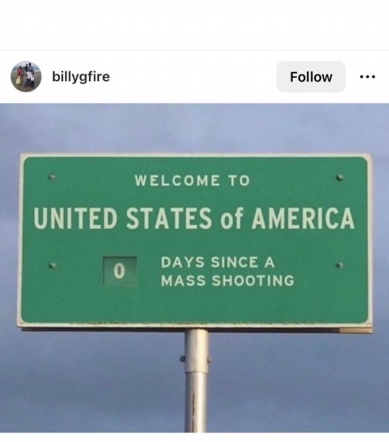 網(wǎng)友Billygfire創(chuàng)作了一塊高速公路廣告牌,上面寫(xiě)道:“歡迎來(lái)到美國(guó),距離上一次大規(guī)模槍擊已經(jīng)過(guò)了0天。”