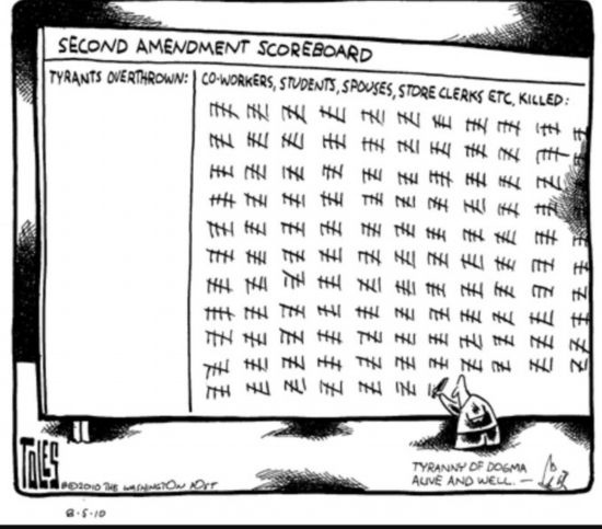 這幅漫畫(huà)題為《第二修正案“得分板”》,右邊顯示因?yàn)榈诙拚杆劳龅耐隆W(xué)生、配偶、商店售貨員等各色人等。美國(guó)憲法第二修正案是美國(guó)公民擁槍的主要法律依據(jù)。