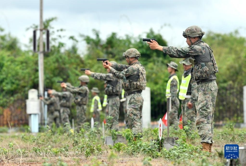 5月13日,在老撾人民軍庫瑪?shù)W(xué)院訓(xùn)練場(chǎng),中方參演官兵進(jìn)行手槍射擊示范。