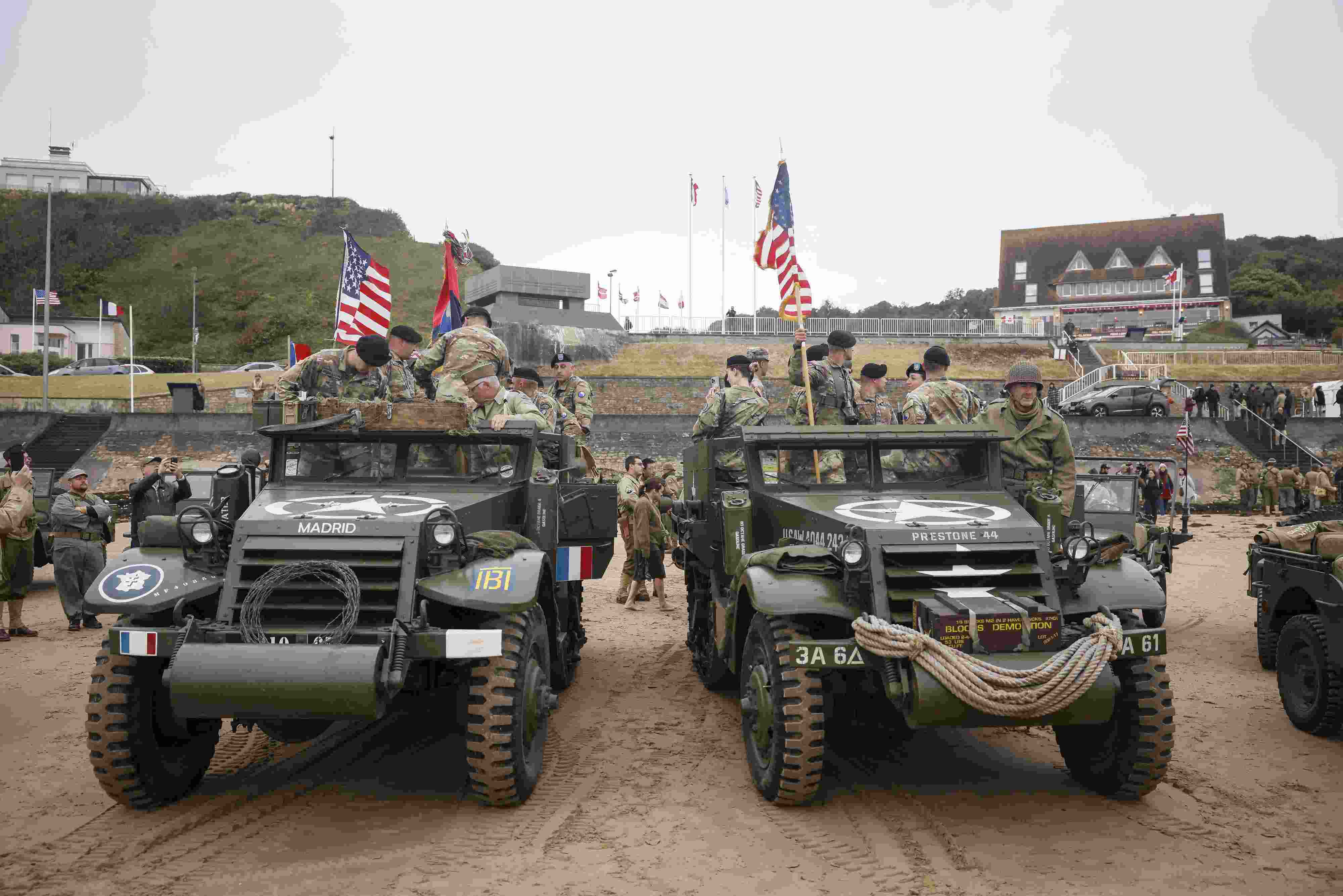 當?shù)貢r間2023年6月6日,法國奧馬哈海灘,人們重現(xiàn)戰(zhàn)爭場景紀念諾曼底登陸。1944年6月6日黎明時分,近16萬盟軍在諾曼底登陸。 視覺中國