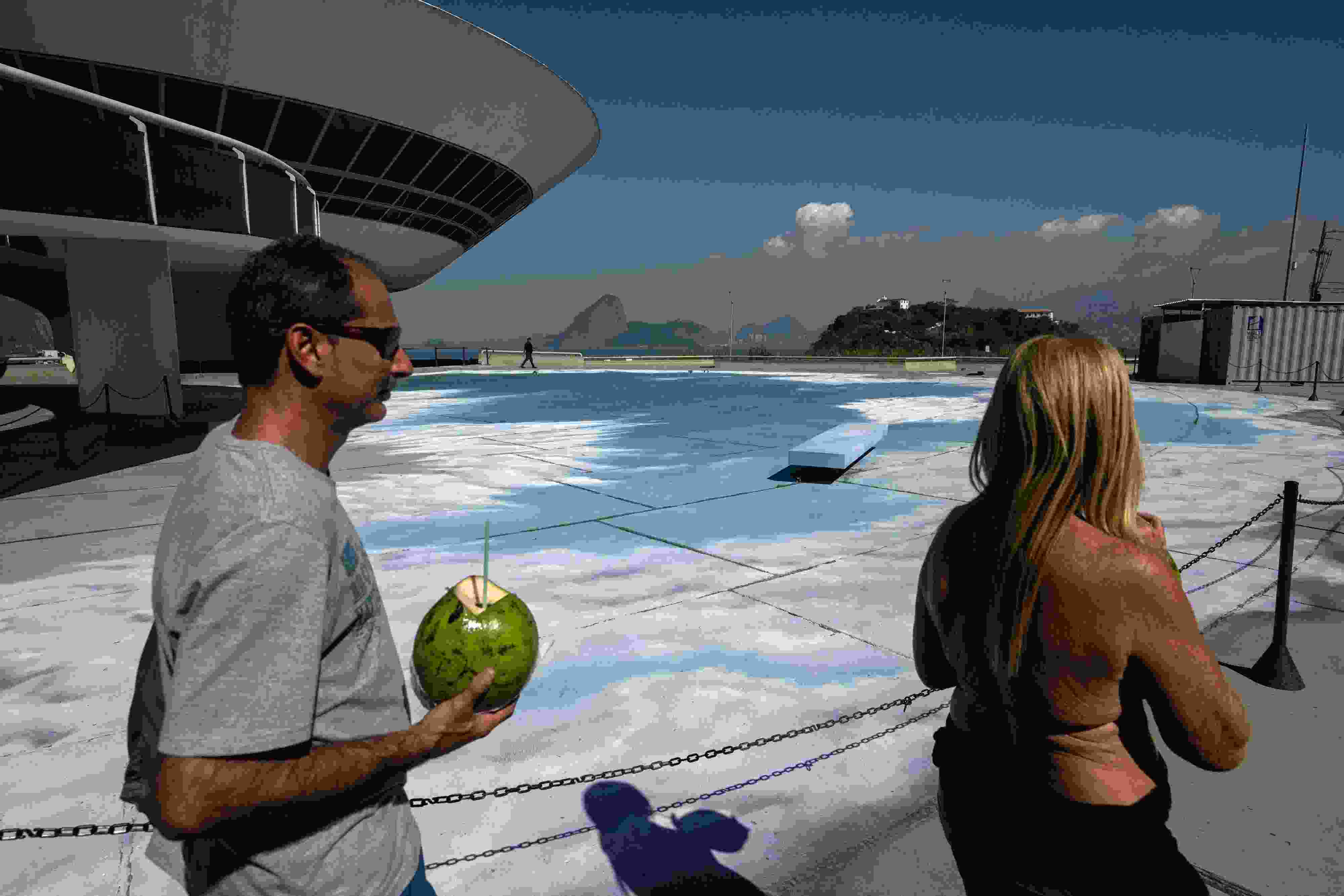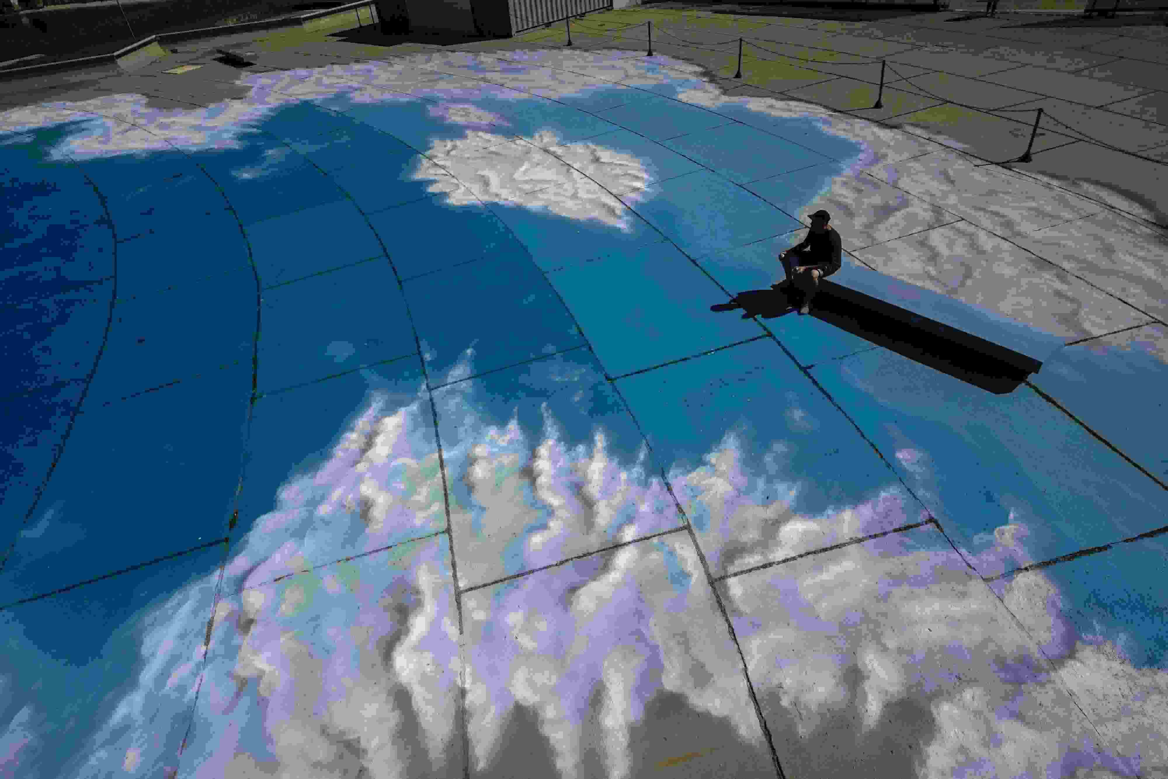 當?shù)貢r間2023年6月6日,巴西里約熱內(nèi)盧,藝術(shù)家在地面上繪制“藍天白云”。 視覺中國