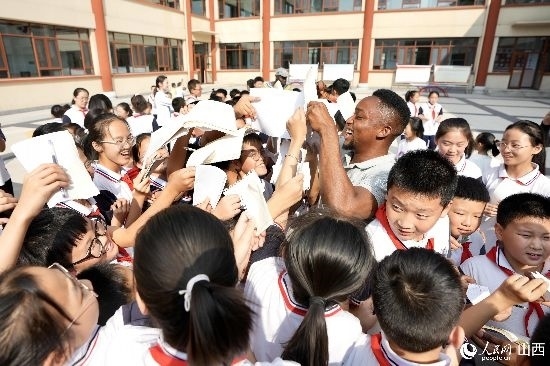 圖為李昊瑞給午亭小學的學生簽名留念。人民網(wǎng) 盧鵬宇攝