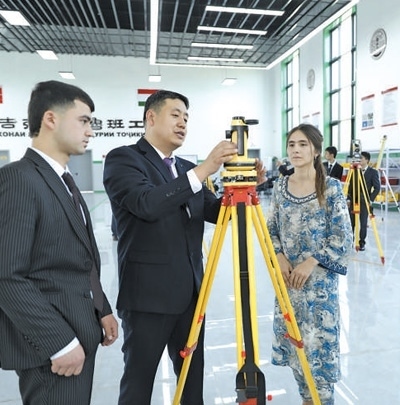 4月12日,在塔吉克斯坦首都杜尚別的魯班工坊內(nèi),來自天津城市建設管理職業(yè)技術(shù)學院的老師吳正鵬(左二)向?qū)W生講解測繪儀器使用方法。奧斯帕諾夫攝(新華社發(fā))
