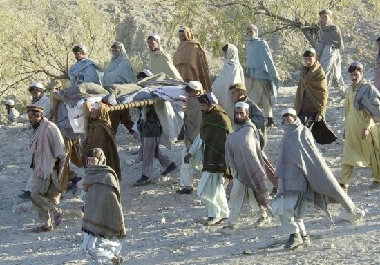 這是2001年12月19日,阿富汗托拉博拉地區(qū)的一群村民為一個(gè)被集束炸彈炸死的22歲年輕人送葬。這名年輕人在撿柴火的時(shí)候被一枚集束炸彈炸死。新華社發(fā)