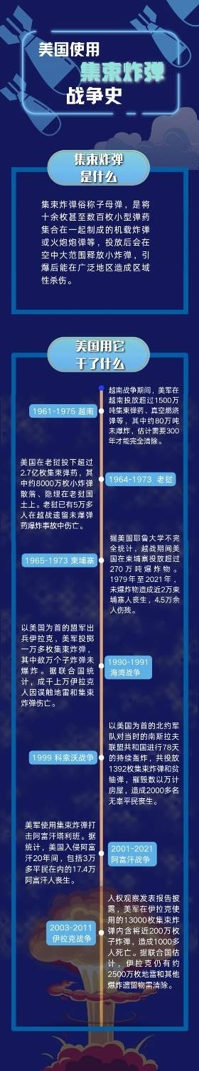 集束彈藥比普通彈藥殺傷力更強(qiáng)、造成平民傷亡可能性更大。美國(guó)空軍曾經(jīng)在越南戰(zhàn)爭(zhēng)、海灣戰(zhàn)爭(zhēng)、伊拉克戰(zhàn)爭(zhēng)等戰(zhàn)事中大量使用集束炸彈,給這些國(guó)家民眾及子孫后代帶來(lái)無(wú)法磨滅的傷痛。