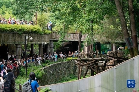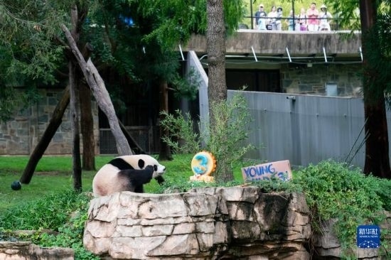 8月21日,游客在美國(guó)首都華盛頓史密森學(xué)會(huì)國(guó)家動(dòng)物園觀看大熊貓幼崽“小奇跡”過(guò)生日。新華社記者 劉杰 攝