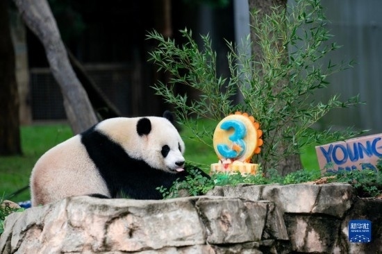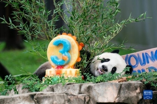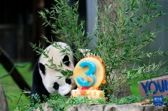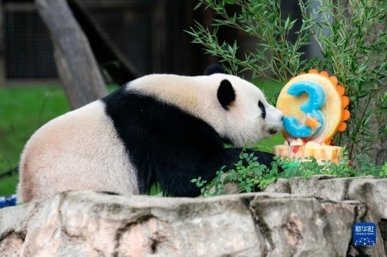 8月21日,大熊貓幼崽“小奇跡”在美國(guó)首都華盛頓史密森學(xué)會(huì)國(guó)家動(dòng)物園享用生日蛋糕。新華社記者 劉杰 攝