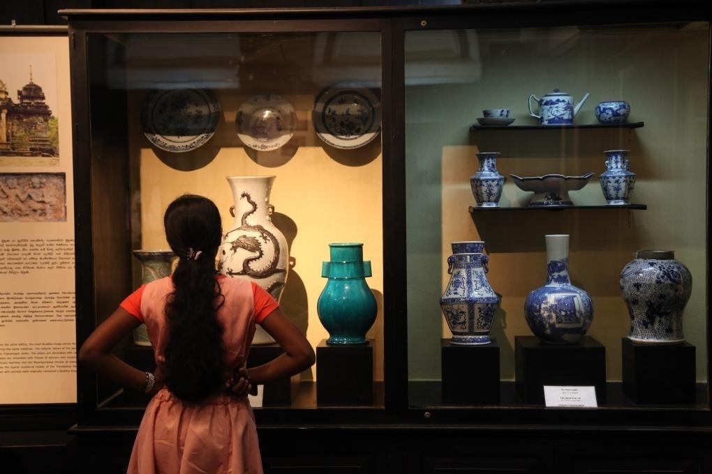 2014年9月15日,在斯里蘭卡首都科倫坡,游客參觀斯里蘭卡國家博物館展出的當(dāng)?shù)爻鐾恋闹袊糯善?,一些中國外銷瓷器上還繪有南亞、伊斯蘭風(fēng)情,與鄭和碑共同見證著古代海上絲綢之路和中斯友好交往的源遠(yuǎn)流長。 新華社記者馮武勇攝