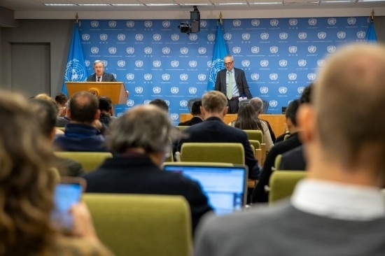 10月9日,在位于紐約的聯(lián)合國總部,聯(lián)合國秘書長(zhǎng)古特雷斯(后左)在記者會(huì)上就巴以局勢(shì)發(fā)表談話。新華社發(fā)(聯(lián)合國供圖/保羅·菲爾蓋拉斯攝)