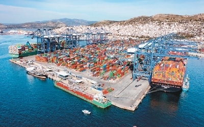 2022年2月19日拍攝的希臘比雷埃夫斯港集裝箱3號(hào)碼頭。作為共建“一帶一路”倡議的典范項(xiàng)目,希臘比雷埃夫斯港年貨物吞吐量達(dá)500萬標(biāo)箱以上。新華社發(fā)