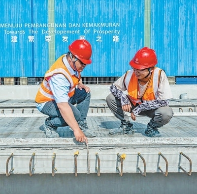 馬來西亞吉蘭丹州的馬東鐵項目一分部制梁場,技術(shù)人員討論生產(chǎn)情況。新華社記者 朱 煒攝