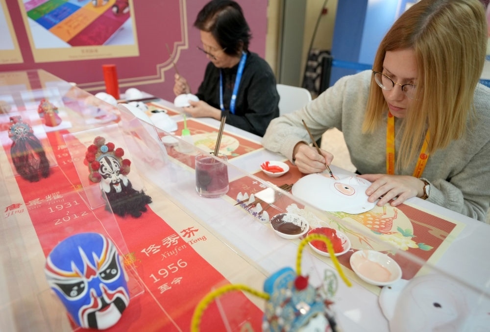 10月16日,在第三屆“一帶一路”國(guó)際合作高峰論壇新聞中心,來(lái)自比利時(shí)的記者(右)體驗(yàn)畫(huà)京劇臉譜。新華社記者 王毓國(guó) 攝